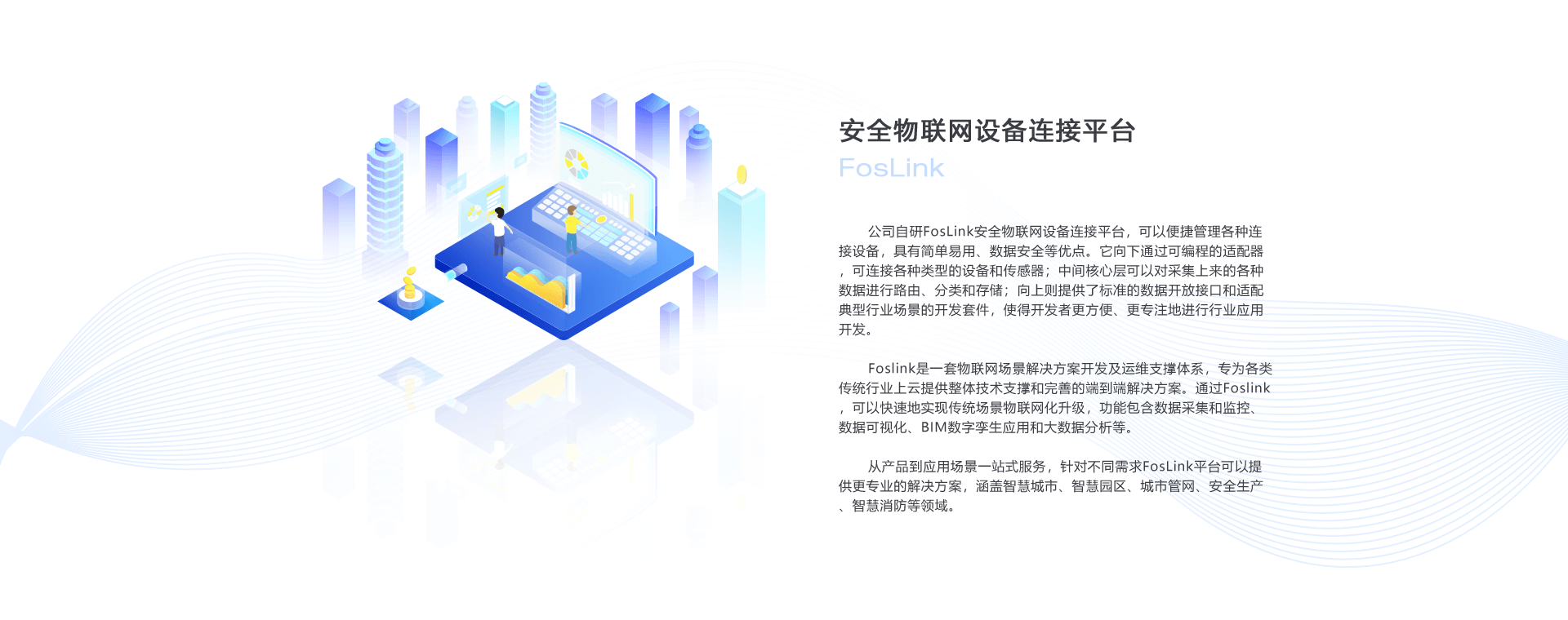 公司自研FosLink安全物聯(lián)網(wǎng)設(shè)備連接平臺(tái),可以便捷管理各種連接設(shè)備,具有簡(jiǎn)單易用、數(shù)據(jù)安全等優(yōu)點(diǎn)。它向下通過可編程的適配器,可連接各種類型的設(shè)備和傳感器;中間核心層可以對(duì)采集上來的各種數(shù)據(jù)進(jìn)行路由、分類和存儲(chǔ);向上則提供了標(biāo)準(zhǔn)的數(shù)據(jù)開放接口和適配典型行業(yè)場(chǎng)景的開發(fā)套件,使得開發(fā)者更方便、更專注地進(jìn)行行業(yè)應(yīng)用開發(fā)。